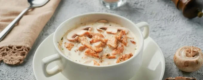 Keitto, jossa on sieniä ja sulatettua juustoa