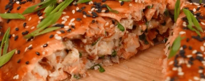 Tämä resepti on ruokalaji, joka valloittaa herkkyyden ja voimakkaan maun tasapainollaan. Mehukas lohi, katkarapujen ja pinaatin tuoksuva täyte, paksu suluguni ja kiiltävä teriyakikastikkeen kuorrutus – tämä ruokalaji kirjaimellisesti sulaa suussa. Ja mikä parasta, se on valmis alle puolessa tunnissa.